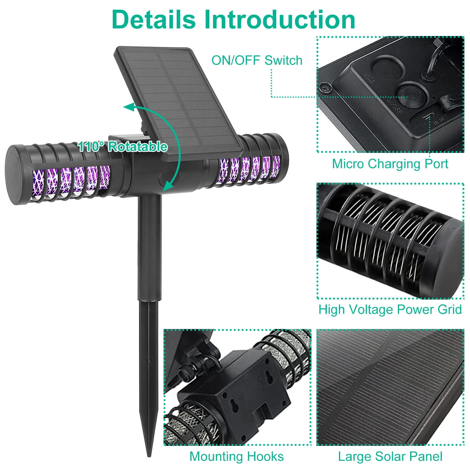Equipped with a high-efficiency solar panel and a built-in 2200mAh 18650 lithium battery, this mosquito killer lamp supports both solar and USB charging.